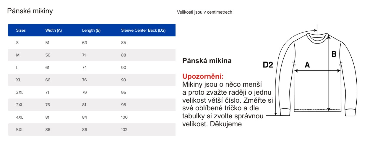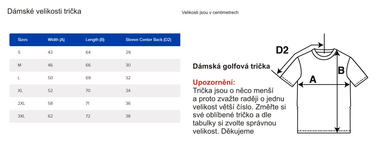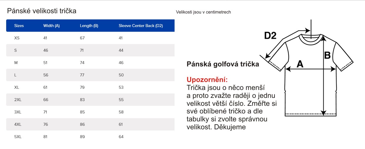 Velikosti jsou uvedeny v centrimetrech. Prosím před nákupem si pečlivě změřte rozměry abyste měli správnou velikost. Ideálně tak, že si změříte dané rozměry na svém oblíbeném tričku co máte doma a dle tabulky vyberete stejnou velikost.